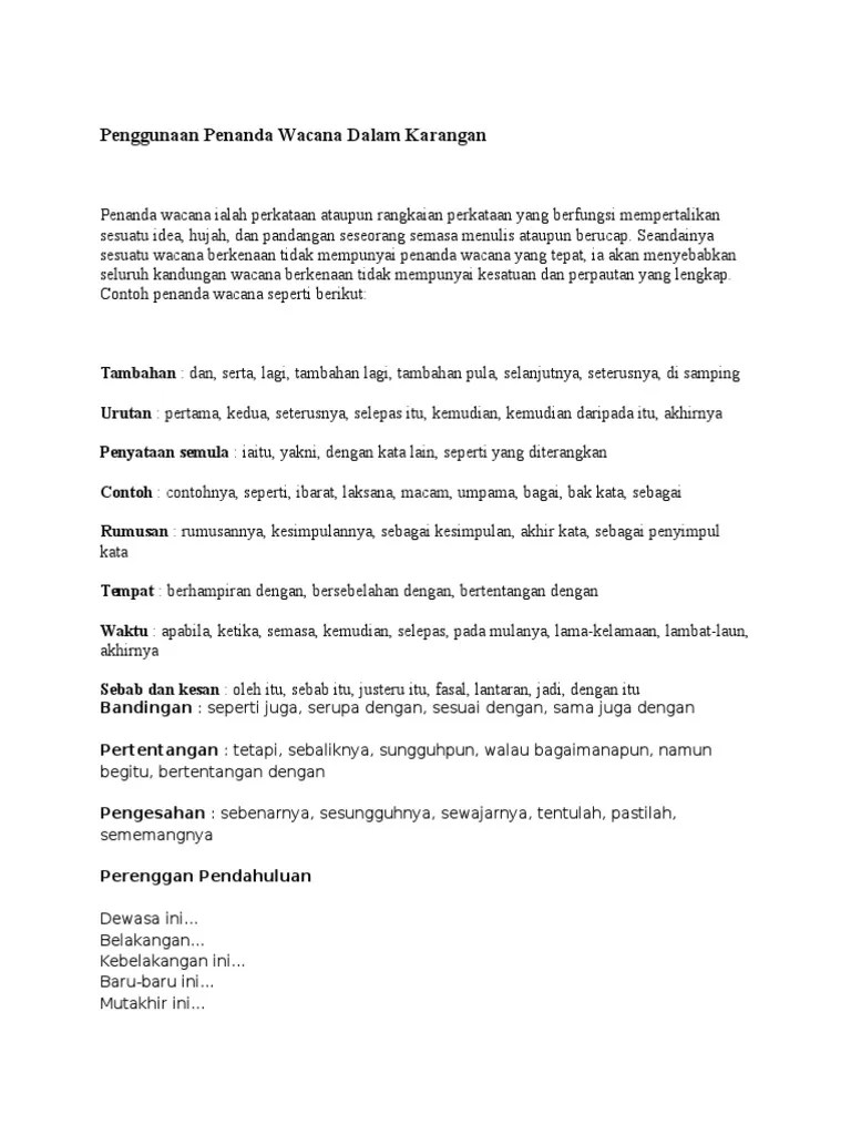 Contextual translation of contoh penanda wacana bahasa eng into english. Penanda wacana bahasa inggeris google search essay writing skills essay. I am fluent in english and bahasa melayu | intermediate: For instance (misalnya) in the case of (dalam kes) as revealed by… Okay, many people who learn english as their secondary language struggle to use penanda wacana (or discourse · cause and effect: